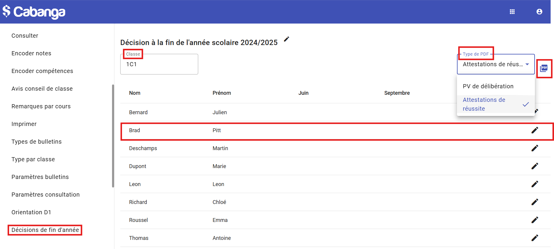 Vous pouvez imprimer le PV de délibération ou les attestations de réussite de la classe en sélectionnant le "Type de PDF" désiré et en cliquant sur l'icône "PDF" qui se trouve en haut à droite dans la page Bulletins / Décisions de fin d'année.