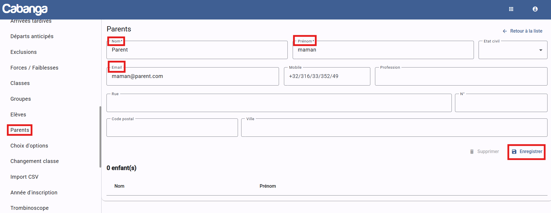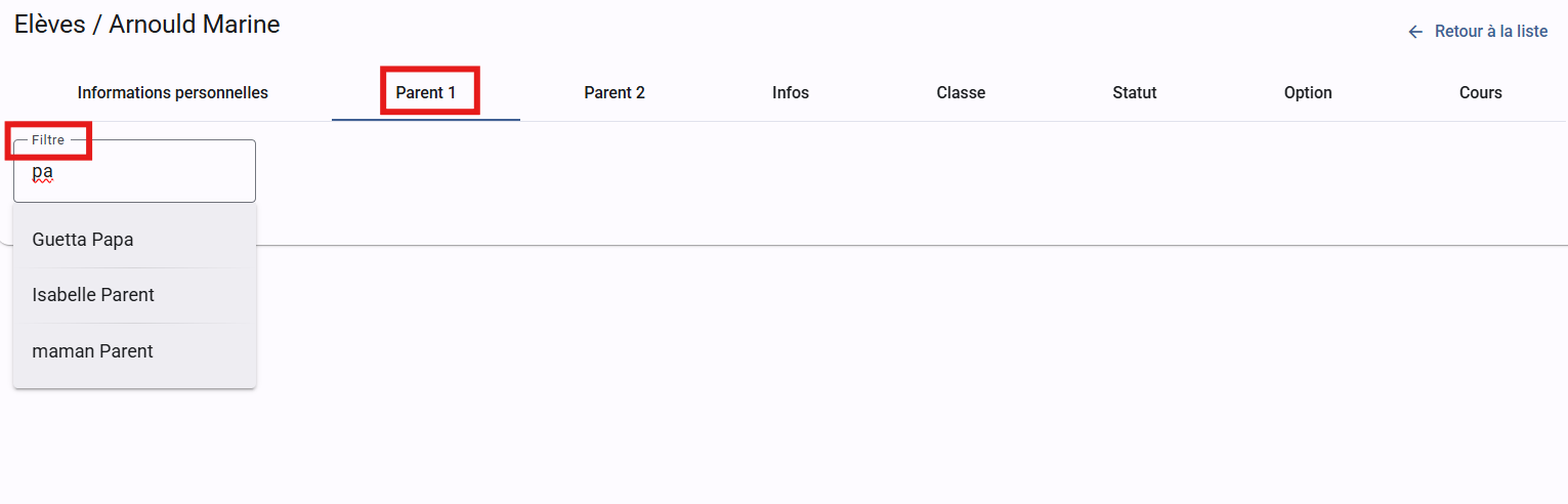 En vue de limiter un maximum la quantité d'informations à encoder, nous vous proposons d'enregistrer les parents sur une page spécifique. De cette manière, si un parent change d'adresse, de numéro de téléphone, d'email, et que ce parent a par exemple 3 enfants dans votre école, il vous suffit de faire la modification sur le parent et non sur les 3 enfants.