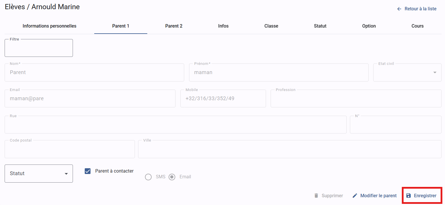 - Choisir les options : Statut, Parent à contacter ?
