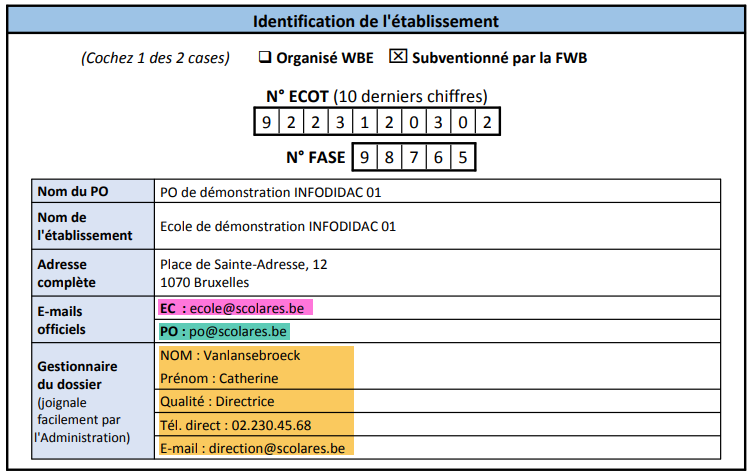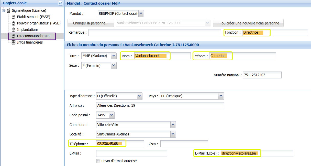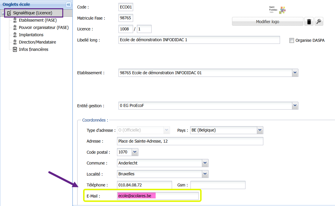 L’adresse e-mail de l’école doit être complétée sous l’onglet "Signalétique (Licence)" pour être reprise dans l’e-mail EC des mails officiels :