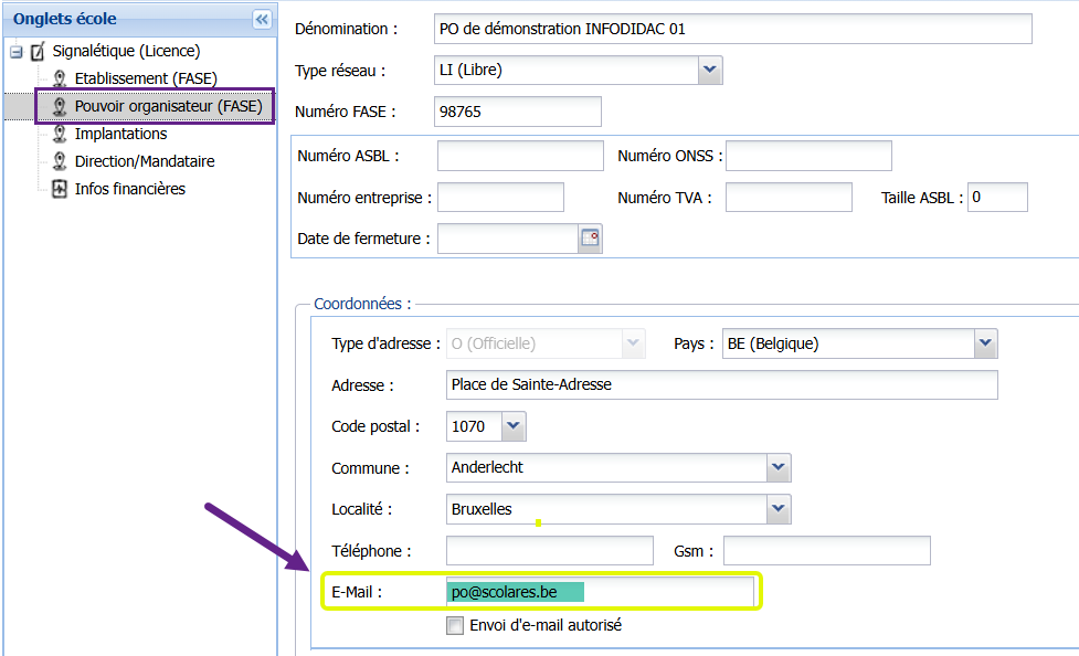 1.2.2. E-mail du PO dans "Pouvoir Organisateur (FASE)"
