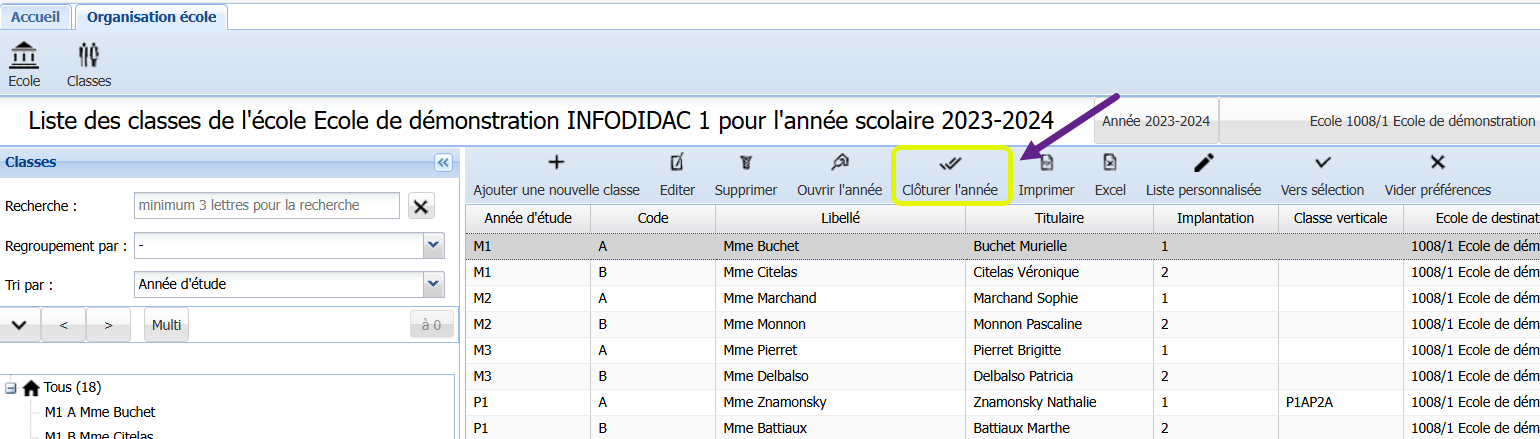 La clôture de l’année scolaire est désormais une fonctionnalité à part entière dans ProEco5. En ce début d’année 2024-2025, il convient de procéder à la clôture de l’année 2023-2024. Pour ce faire, vous vous positionnez sur l’année scolaire 2023-2024 via le menu de contexte actif. Ensuite, vous entrez dans l’application Organisation école. Dans le module Classe, il y a un bouton "Clôturer l’année" :
