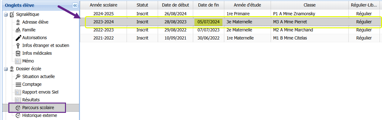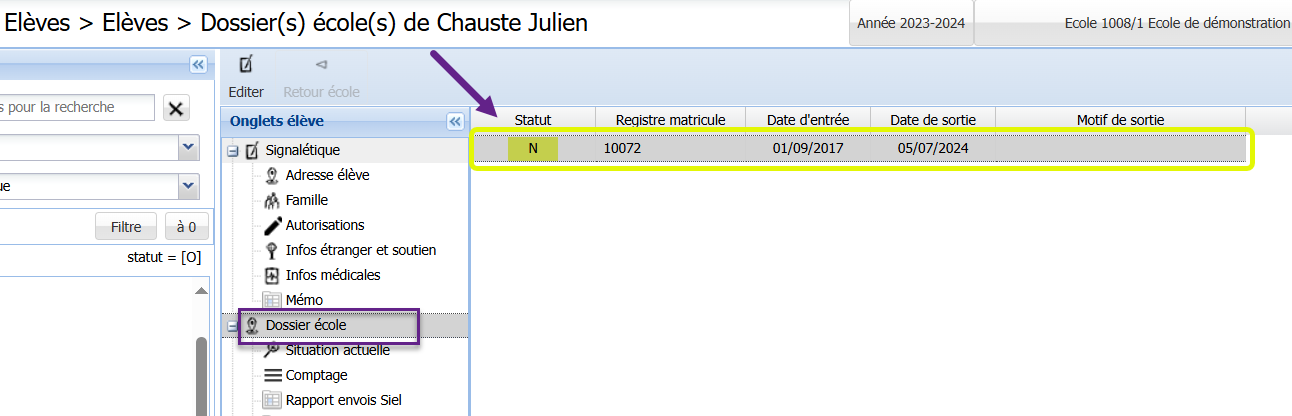 Et le dossier d’inscription des élèves qui ont réussi la dernière année organisée dans votre école (ex. P6) acquiert un statut N (sorti) :