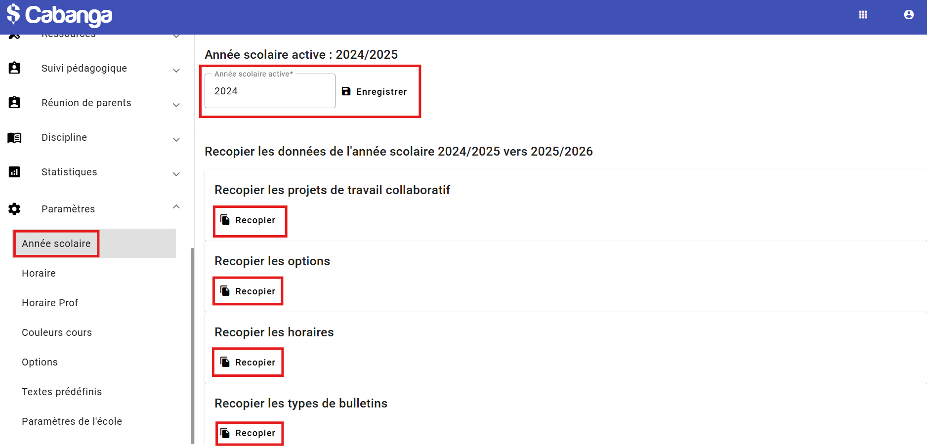 Permet de changer d'année scolaire et de recopier les données dans l'année suivante.