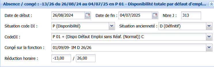 Le champ <Réduction horaire> ne s’affiche qu’après la sélection du code DI. Vous le remplissez en fonction de la réduction (partielle ou totale) de charge que subit le membre du personnel mis en disponibilité.