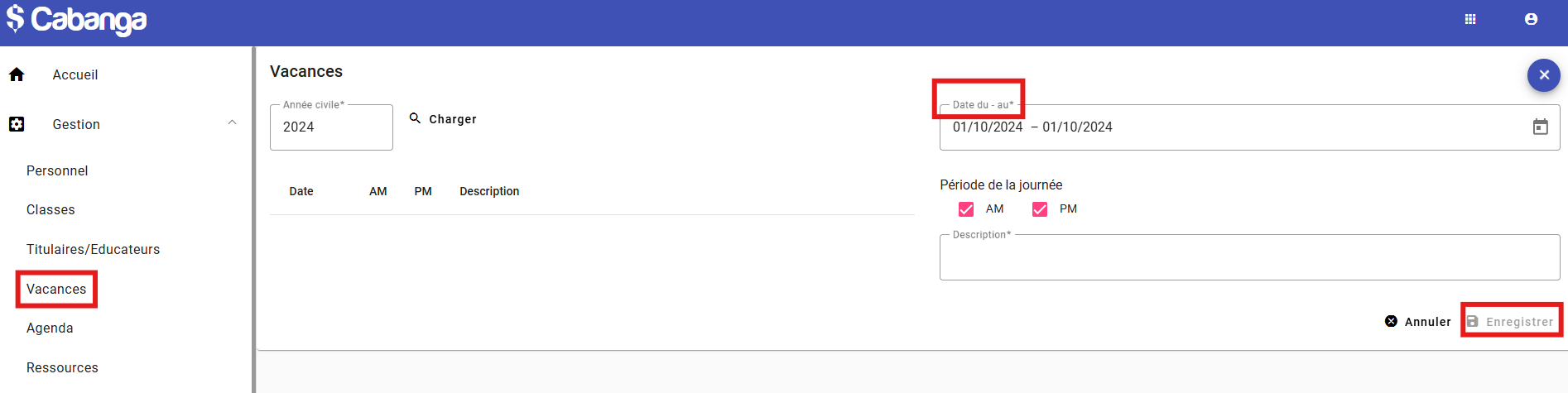 Vous pouvez encoder les vacances scolaires en cliquant sur le