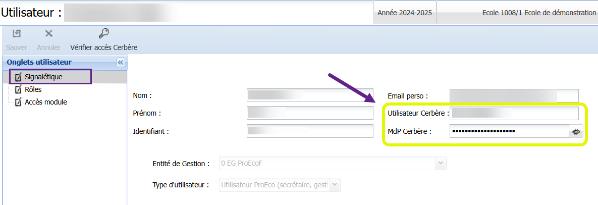 L’utilisateur – qui a le droit GEDI auprès de la FWB – doit encoder son nom d’utilisateur ainsi que son mot de passe Cerbère dans ProEco5. Cet encodage s’effectue sous l’onglet Signalétique de la fiche d’utilisateur, dans l’application Administration :