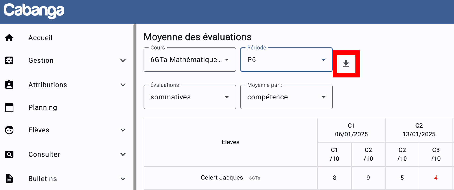 Le professeur pourra faire un export de son carnet de cotes, via la page Carnet de cotes / Moyennes