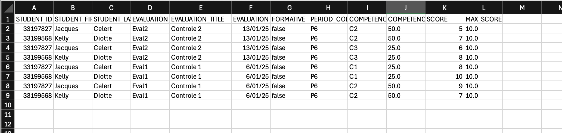 Avant de transmettre votre fichier à une IA, il est impératif de l’anonymiser pour être en conformité avec le RGPD : vous ne pouvez en aucun cas divulguer des informations permettant d’identifier un mineur. Pour cela, supprimez les colonnes « school_ID », « Year», « Prénom »,... et remplacez le nom de chaque élève par un simple numéro.