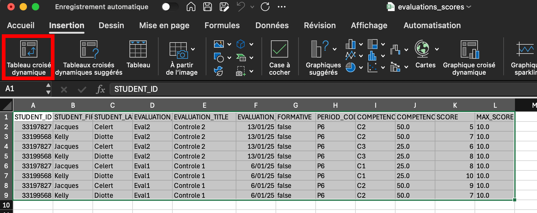 Sélectionnez toutes les données, allez dans Insertion et cliquez sur Tableau croisé dynamique