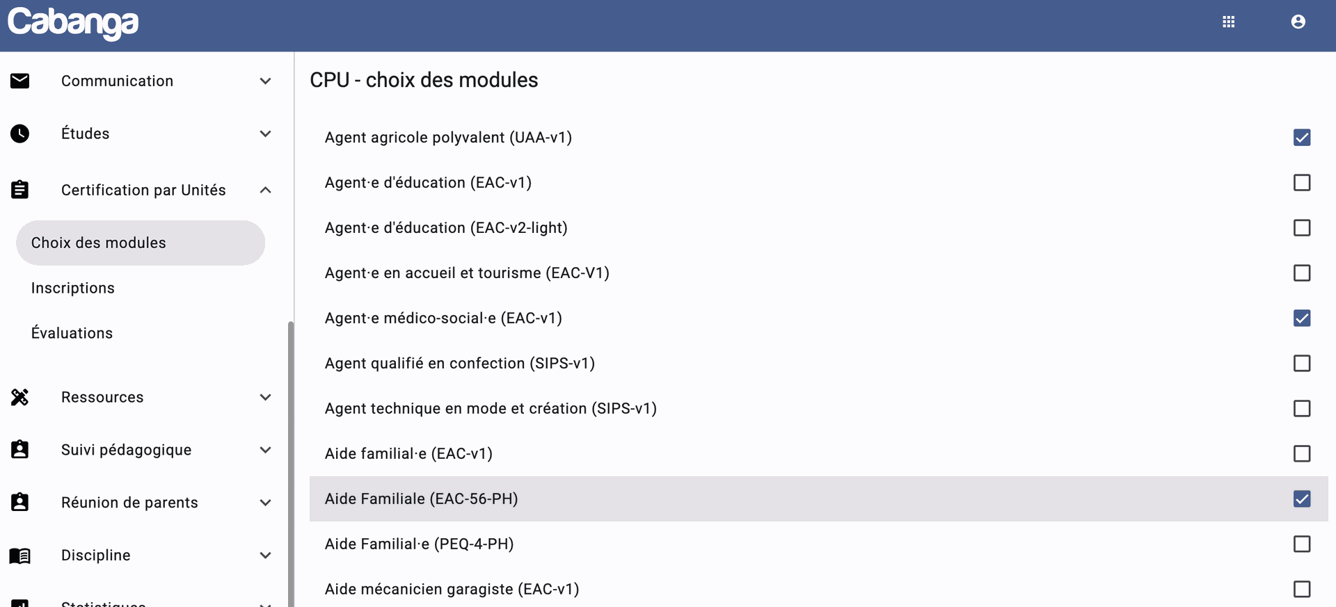 Pour ne pas avoir une liste trop longue dans les pages Inscription et Evaluation, vous devez cocher les modules utilisés dans votre école dans la page Certification par unités / Choix des modules.
