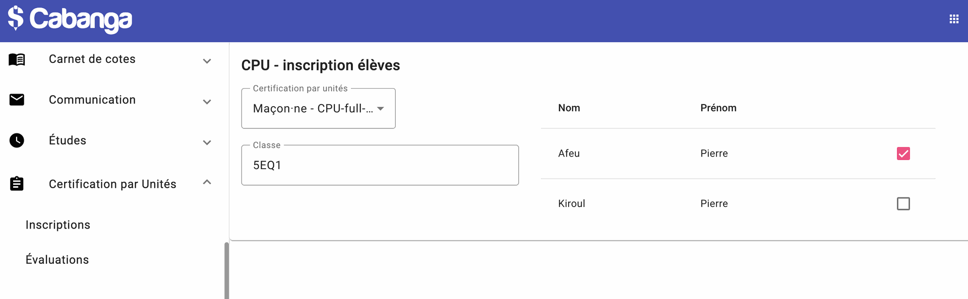 Dans l'onglet "Certification par Unités / Inscriptions", vous définissez les élèves qui suivent une formation dont ils devront certifier les unités. Pour cela, vous sélectionnez d'abord le module dans lequel vous allez ajouter des élèves, vous sélectionnez la classe cible, et vous cochez les élèves.