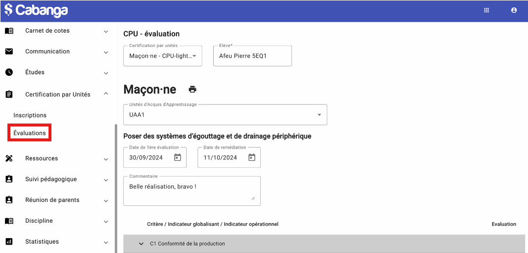 Vous pouvez alors choisir quelle UAA / UQ / SIPS vous souhaitez évaluer. Vous pouvez ensuite définir la date de l'évaluation de l'UAA, éventuellement la date à laquelle une remédiation a été effectuée, et encoder un commentaire.