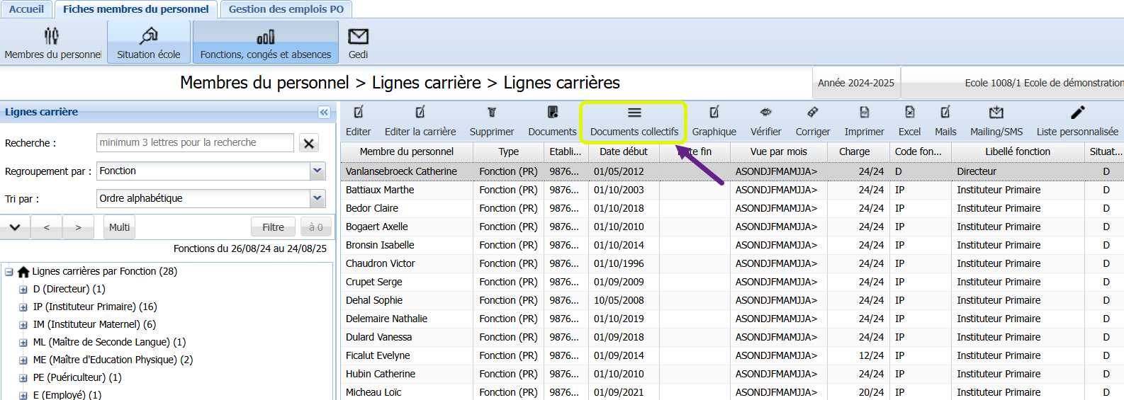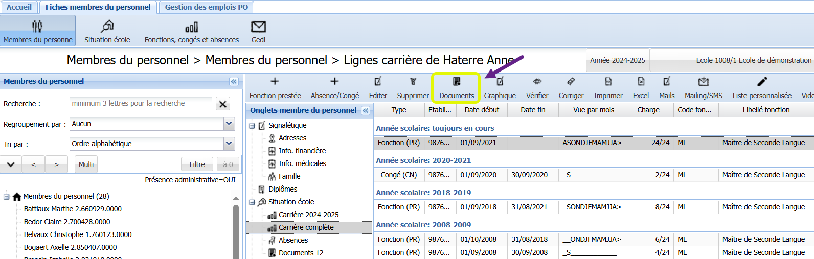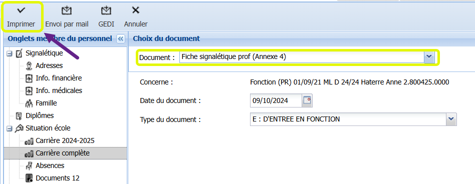 Avant toutes choses, il faut imprimer le document individuel du membre du personnel suivant la procédure habituelle : en se positionnant sur l’onglet Carrière et en appuyant sur le bouton <Documents>.