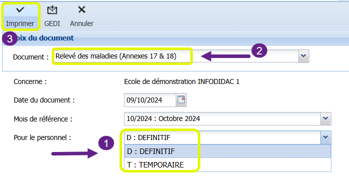 Il faut ensuite sélectionner le relevé de maladies, préciser le statut des membres du personnel concernés et imprimer.