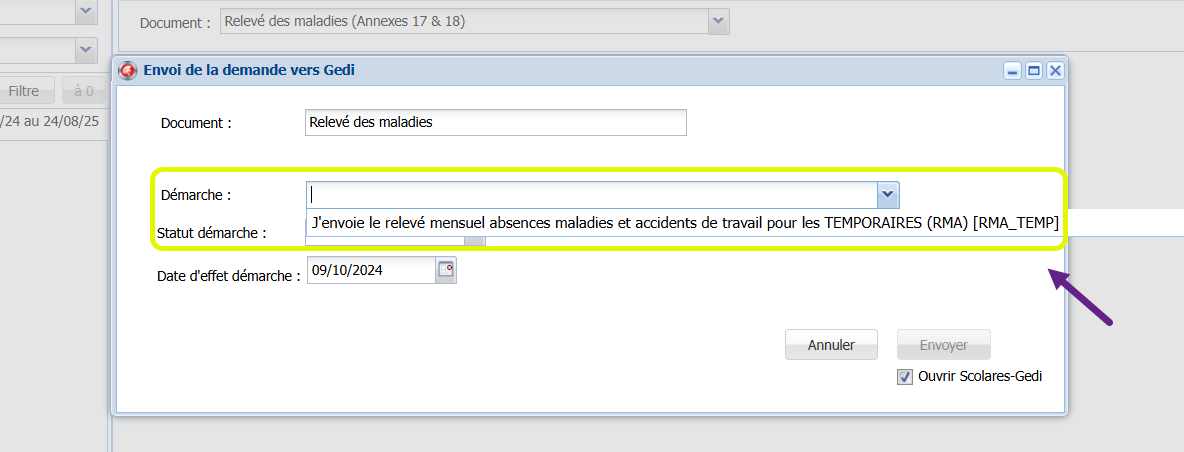 Après avoir rattaché le document à une démarche, il faut sélectionner son statut et l'envoyer dans GEDI.