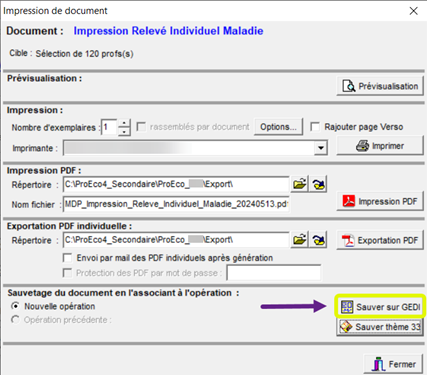 Lors de l’impression en série des relevés individuels de maladie, vous avez la possibilité de "Sauver sur GEDI".