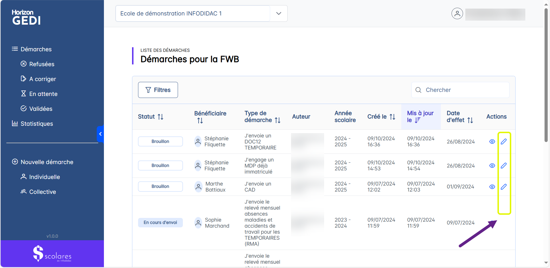Pour éditer une démarche, il faut cliquer sur l’icône en forme de crayon