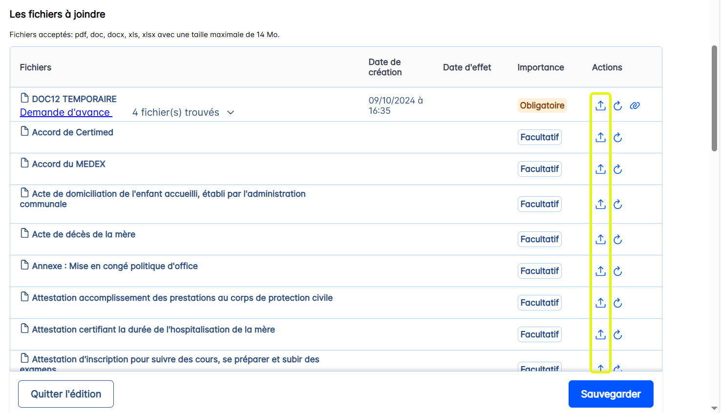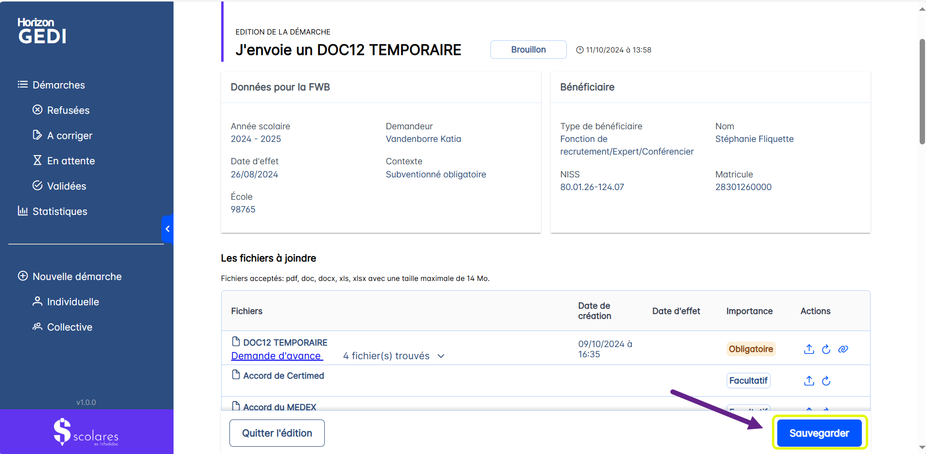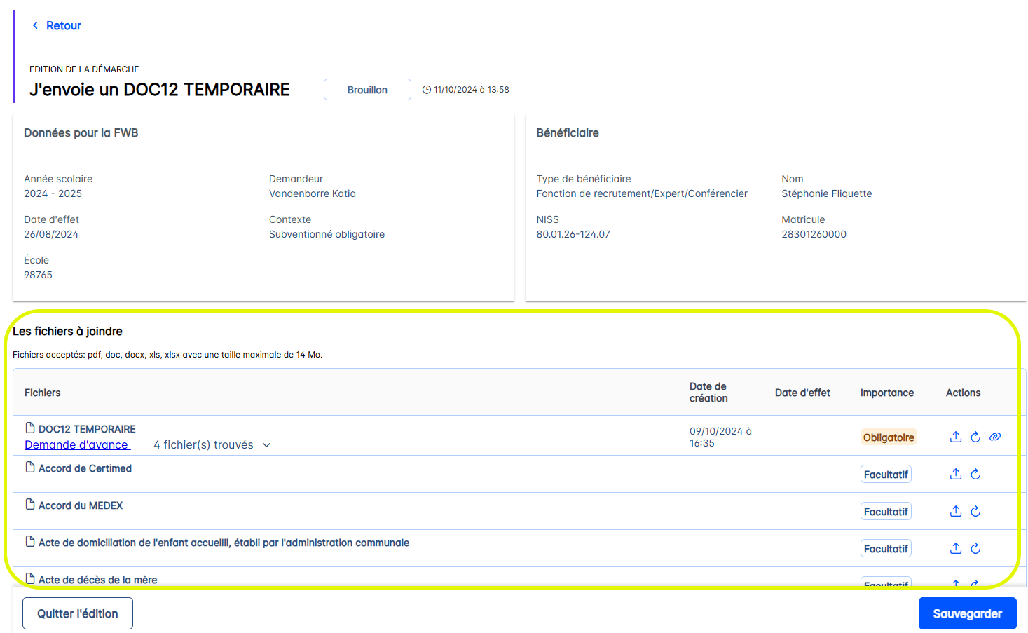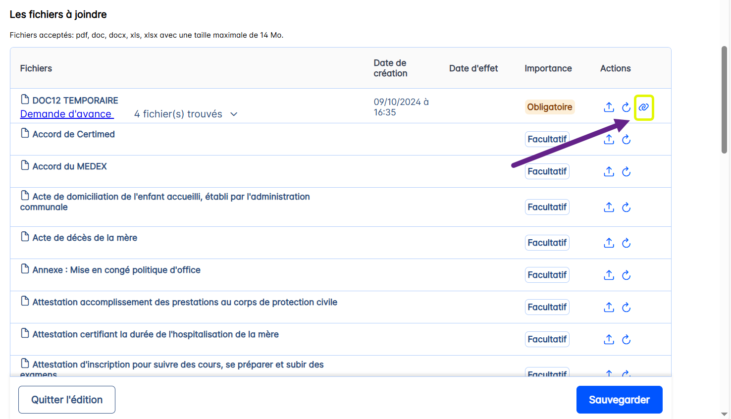 Lorsque toutes les modifications ont été effectuées dans les fichiers joints à la démarche, il faut appuyer sur le bouton <Sauvegarder>.