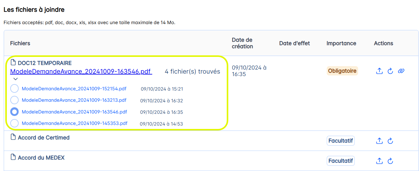 Lorsque vous cliquez dessus, vous accédez à vos dossiers, parmi lesquels vous pouvez sélectionner le fichier adéquat. À l’issue du téléchargement, le fichier est joint à la démarche, dans la catégorie correspondante de document.