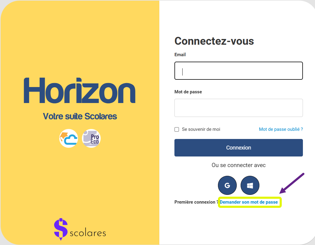 Sur la page de connexion d’Horizon, vous faites une demande de mot de passe. Pour ce faire, vous cliquez sur <Demander son mot de passe> :