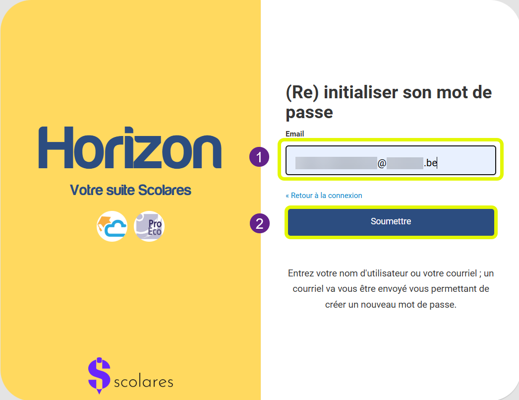 À partir du printemps 2025, les utilisateurs de ProEco5 passent progressivement à un nouveau mode de connexion via l’URL https://proeco.scolares.be. Lors de la première connexion, les utilisateurs doivent s’authentifier, en faisant une demande de mot de passe et en en soumettant un nouveau. Après cette authentification initiale, les utilisateurs sont enregistrés dans le système.