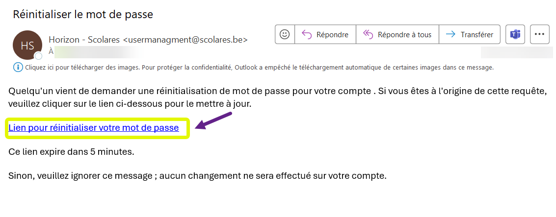 Dans votre boîte mail, vous ouvrez l’e-mail qui a été envoyé par Horizon-Scolares et vous cliquez sur le <Lien pour réinitialiser votre mot de passe> :