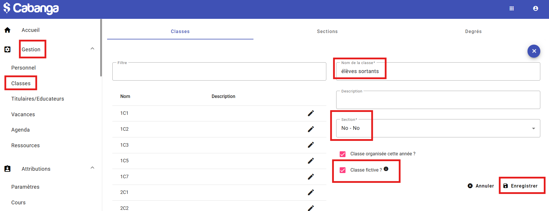 Dans la page Gestion / Classes, vous allez créer un degré "NO", une section "NO" (ou autres noms)