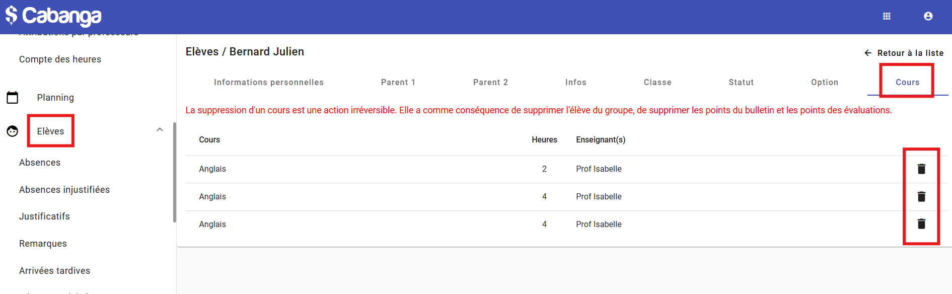 Il n'est pour le moment pas possible de supprimer complètement un élève dans Cabanga.