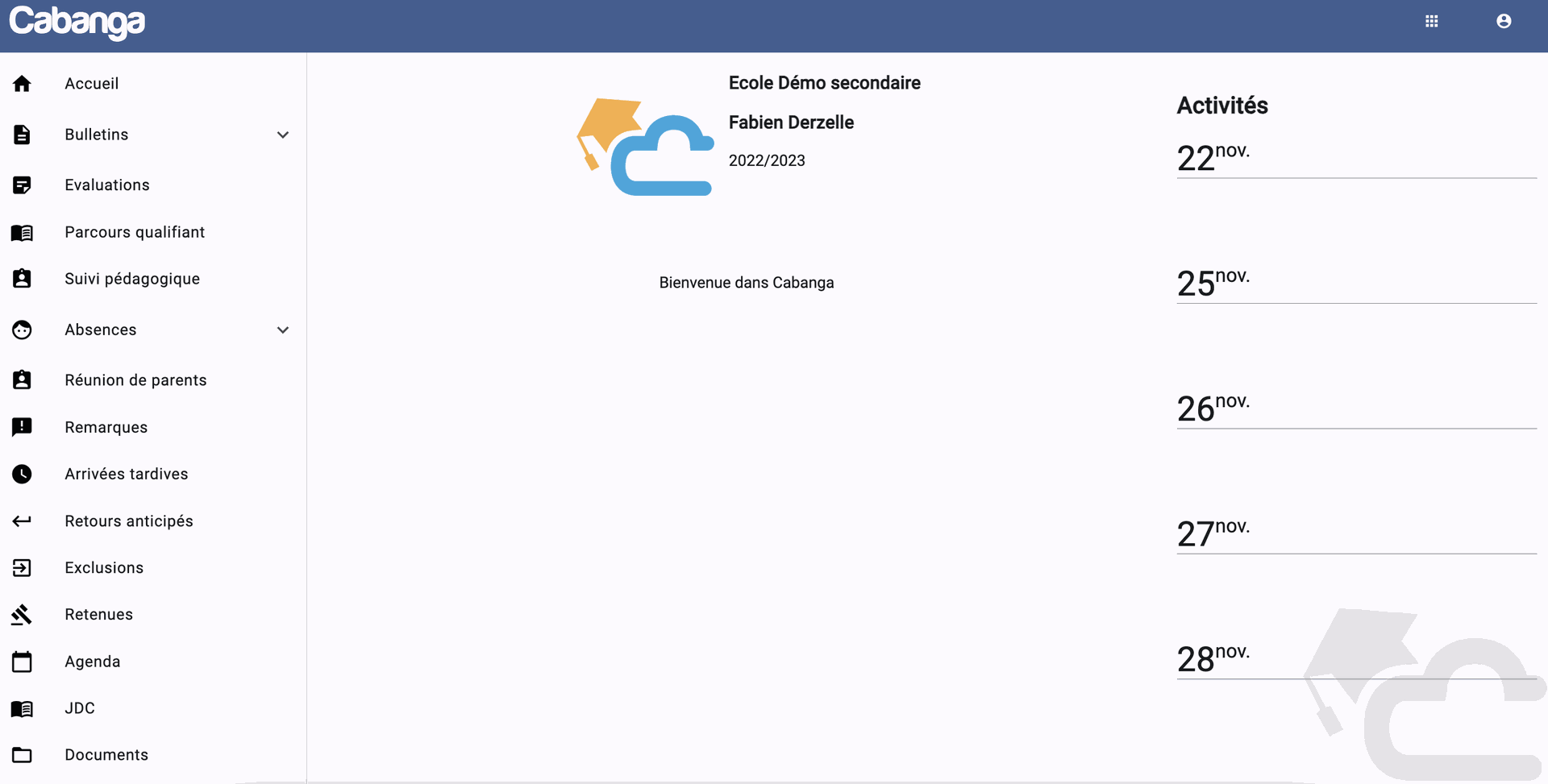 Voici le menu disponible pour un utilisateur connecté en tant que parent.