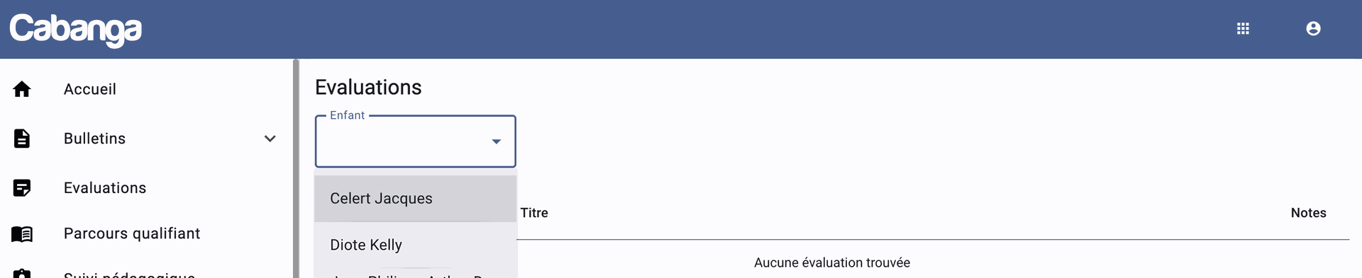 Le parent aura accès à ses enfants via une connexion unique et pourra consulter les informations de chacun d'eux via le sélecteur suivant.