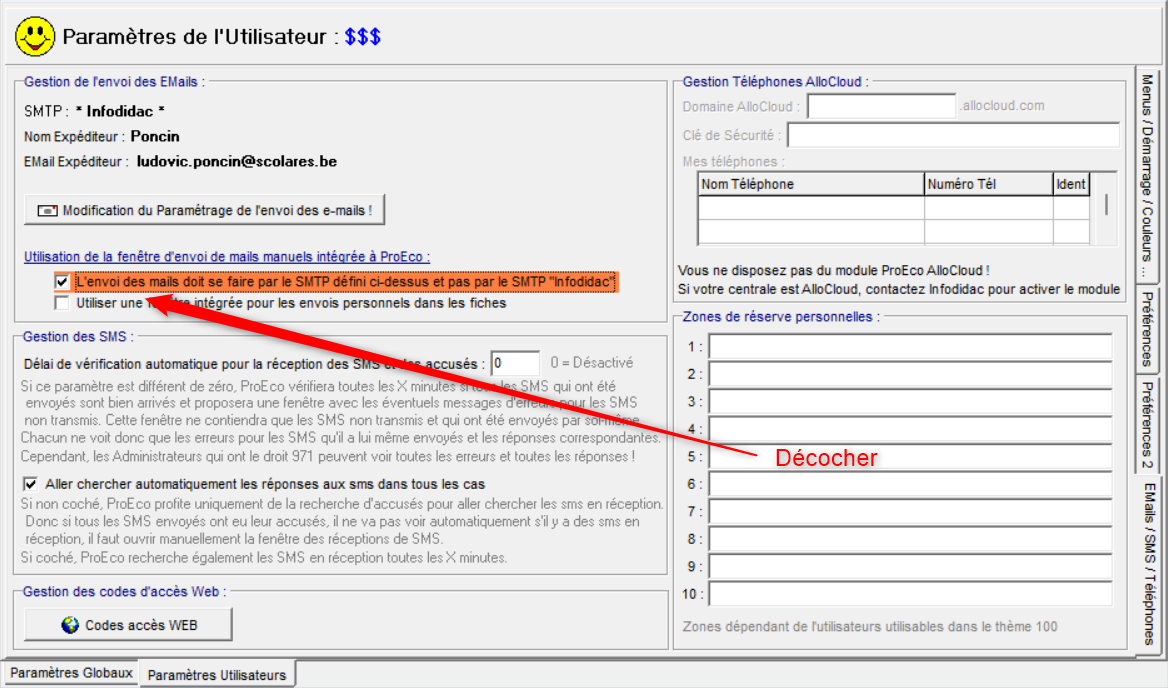 - Par ailleurs, il faut décocher la case "L'envoi des mails doit se faire par le SMTP défini ci-dessus et pas par le SMTP "Infodidac":