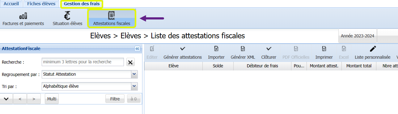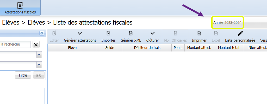 Le fait d’être positionné sur l’année scolaire en cours (par exemple 2023-2024) permet de générer les attestations de l’année fiscale 2023, c’est-à-dire la première année de l’année scolaire.
