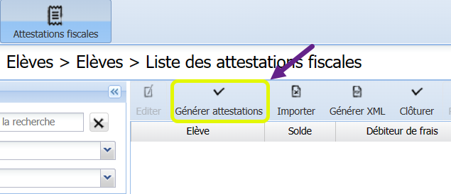 2) Les attestations n’ont pas été générées dans le module Attestations fiscales. Dans ce cas, il suffit de lancer la génération en appuyant sur le bouton <Générer attestations> (en étant positionné sur l’année scolaire en cours).