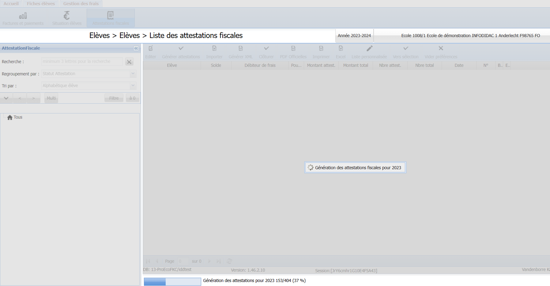 La génération automatique prend du temps car elle calcule toutes les attestations de l’année fiscale pour tous les élèves de l’école : il faut patienter.