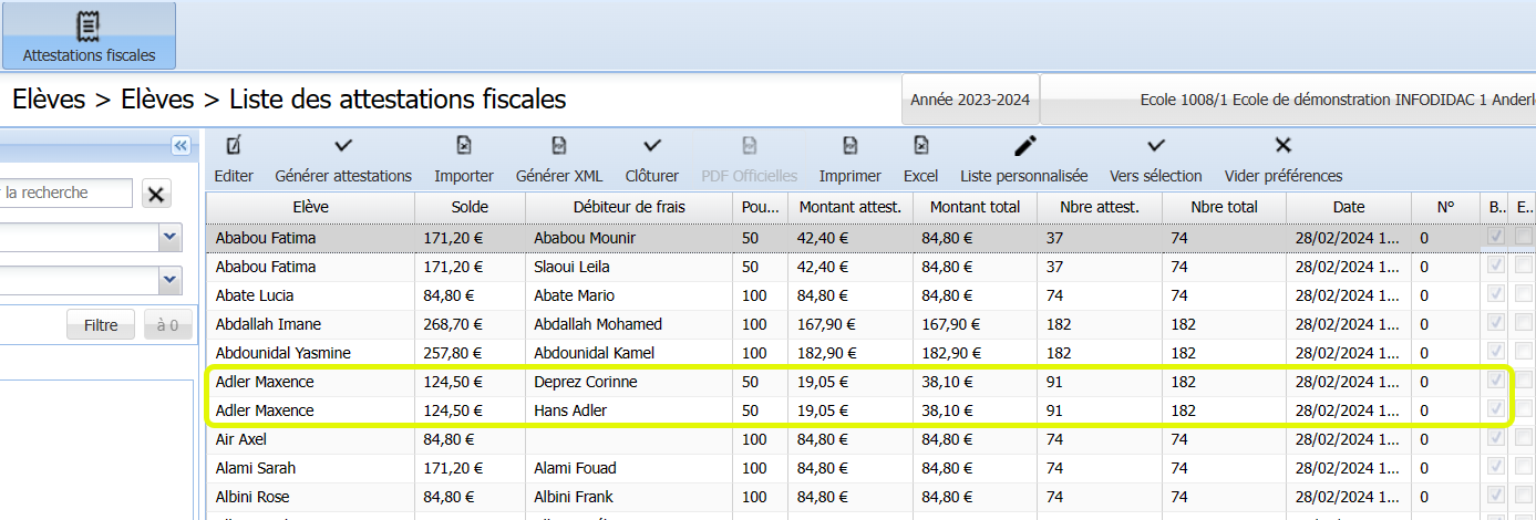 Après la génération des attestations fiscales, l’onglet "Attestations fiscales" reprend également les lignes des attestations générées pour l’élève :