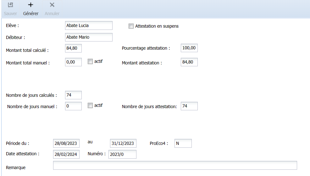 À chaque attestation correspond une fiche. Deux champs sont modifiables : "Montant total manuel" et "Nombre de jours manuel". Le bouton <Générer> sert à relancer la génération de l’attestation de l’élève, ce qui permet d’intégrer les éventuelles modifications ou corrections faites dans son dossier (par exemple, ajouté d’un débiteur de frais).