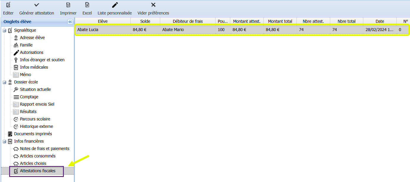 4. Onglet "Attestations fiscales" dans le dossier de l’élève