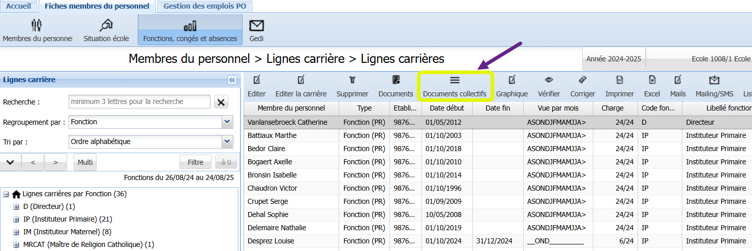 La Déclaration des emplois vacants se télécharge dans l’application Membres du personnel à l’aide du module Fonctions, congés et absences. Dans le menu actions, vous cliquez sur le bouton <Documents collectifs>.