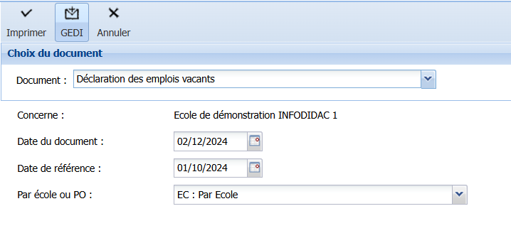 Dans la liste déroulante, vous pouvez sélectionner la Déclaration des emplois vacants. Vous cliquez dessus, vous ajustez éventuellement les dates et vous appuyez sur <Imprimer> dans le menu d’actions. La Déclaration des emplois vacants s’ouvre au format Excel.
