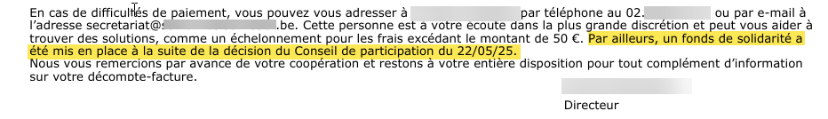 Si cette date est encodée, une phrase supplémentaire s'ajoute sur le décompte-facture au sujet du fonds de solidarité :
