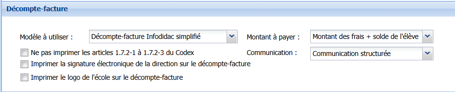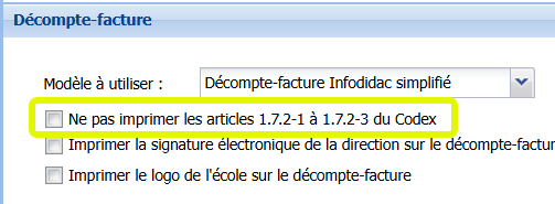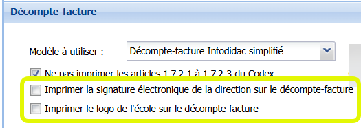 Deux cases à cocher servent à intégrer, si vous le souhaitez, la signature de la direction et/ou le logo de l’école sur le décompte-facture :