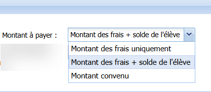 Par défaut, le montant à payer qui figure sur le décompte-facture correspond au total des articles scolaires consommés par l’élève. Ce montant ne reprend dès lors pas le solde de l’élève. Si vous souhaitez inclure le solde de l’élève dans le montant à payer, vous sélectionnez "montant des frais + solde de l’élève" dans la liste déroulante :