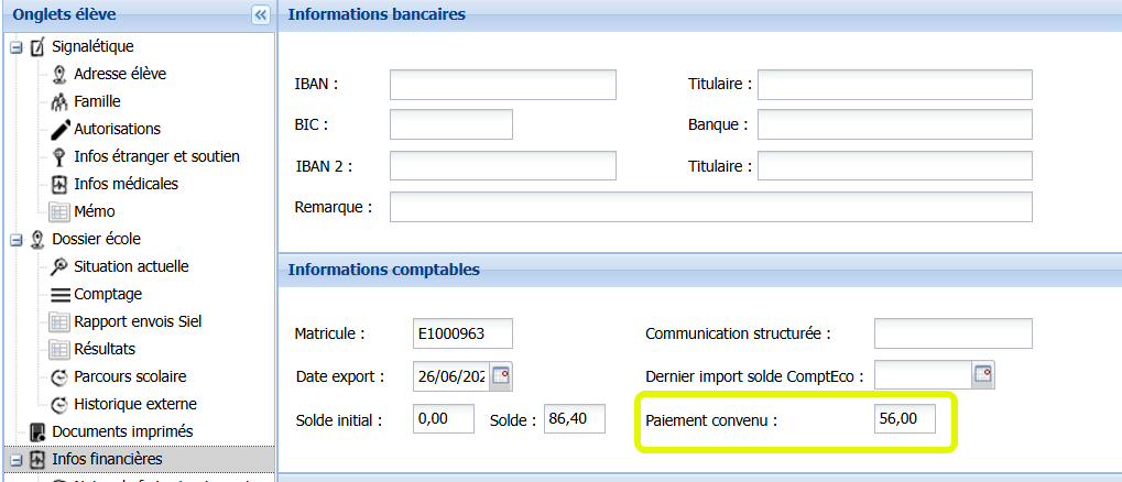Il y a également la possibilité de faire figurer un montant convenu, si vous préférez convenir d’un montant fixe (par exemple, paiement fixe mensuel) par élève. Dans ce cas, le montant convenu doit être encodé dans les infos financières de l’élève :