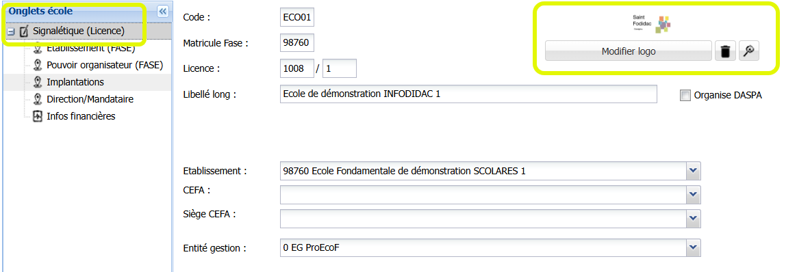 Ce n’est toutefois possible que si les images correspondantes ont été chargées dans ProEco5. Le logo se charge dans la signalétique de l’école :