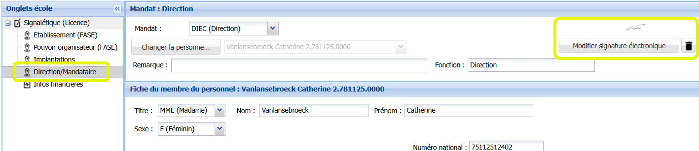 Et la signature se charge dans la fiche de la direction sous l’onglet <Direction/Mandataire> du module École :